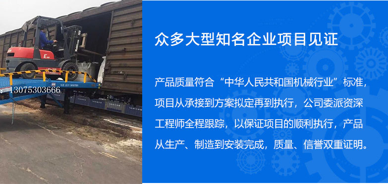>> 13年的登車橋設(shè)備制造經(jīng)驗 集設(shè)計、研發(fā)、生產(chǎn)和銷售于一體的制造型企業(yè),專業(yè)制造液壓登車橋,移動式登 車橋和高空作業(yè)平臺,經(jīng)驗豐富,擁有強(qiáng)大的成產(chǎn)技術(shù)和完善的管理模式。 >> 引進(jìn)國際先進(jìn)施工工藝 配備整套專業(yè)自動化生成設(shè)備,引進(jìn)國外先進(jìn)技術(shù), 定期培訓(xùn),確保設(shè)備的高品質(zhì)。 產(chǎn)品具有設(shè)計新穎、結(jié)構(gòu)合理、升降平穩(wěn)、載重安全、操作簡單、維護(hù)方便等優(yōu)點。